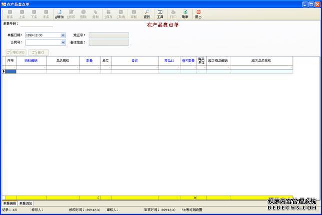 操作路徑:車間在制->在產(chǎn)品出盤點單操作方法:單擊增加按鈕,然后選擇客戶資料,并通過增行和刪行按鈕選擇相應的在產(chǎn)品料號,輸入數(shù)量等信息,然后保存并審核即可。