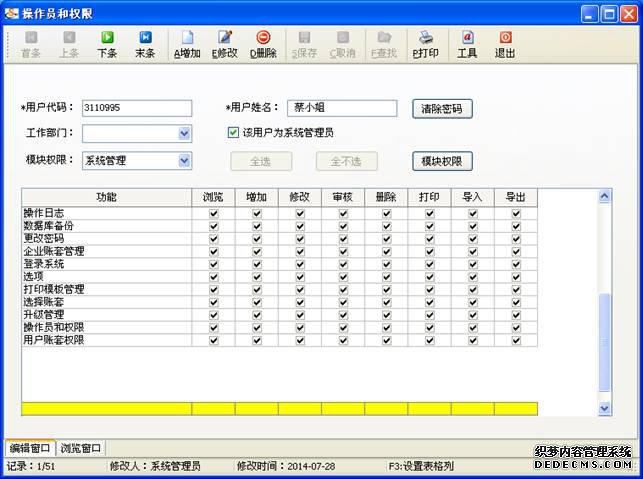 要操作查看、增加、修改、刪除、審核、查找、打印、導入、導出這幾種功能,必需首先要備有相應的操作權限,