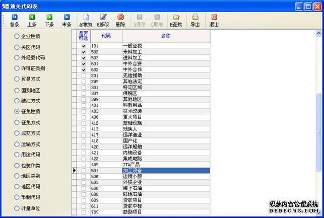操作路徑:報關(guān)管理->通關(guān)代碼設(shè)置設(shè)置報關(guān)單的各項參數(shù)如企業(yè)性質(zhì)、關(guān)區(qū)代碼、貿(mào)易方式、征免方式、運輸方式、包裝種類、計量單位等等。有設(shè)置使用標(biāo)志的報關(guān)單參數(shù)才能在報關(guān)單的選擇框中出現(xiàn)。