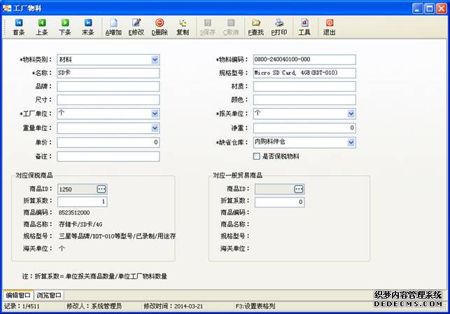 操作路徑:基礎(chǔ)資料->工廠物料工廠物料是指企業(yè)從ERP或其它庫存系統(tǒng)中直接提取,未經(jīng)歸并的企業(yè)生產(chǎn)資料,包括材料、成品、半成品、邊角廢料、設(shè)備等。工廠物料應(yīng)設(shè)置好凈重、倉庫、對應(yīng)報關(guān)商品和折算系數(shù)等信息。折算系數(shù)是指該物料從工廠單位轉(zhuǎn)成海關(guān)單位時的換算比例,折算系數(shù)=報關(guān)數(shù)量 / 工廠數(shù)量,當(dāng)工廠單位和報關(guān)單位一致時,折算系數(shù)等于1,當(dāng)報關(guān)單位為重量單位時,折算系數(shù)就是該物料的凈重。建立一個新的物料時,可以設(shè)置好對應(yīng)保稅或為一般貿(mào)易商品以及折算系數(shù)。