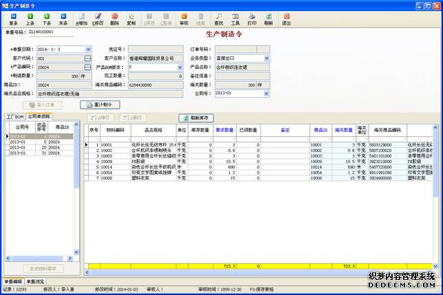 操作路徑:生產(chǎn)管理->生產(chǎn)制造令導入訂單:導入銷售訂單,可以自動引入生產(chǎn)制造令表頭(產(chǎn)品數(shù)量。根據(jù)產(chǎn)品編碼,自動匹配工廠BOM與合同單損耗。)