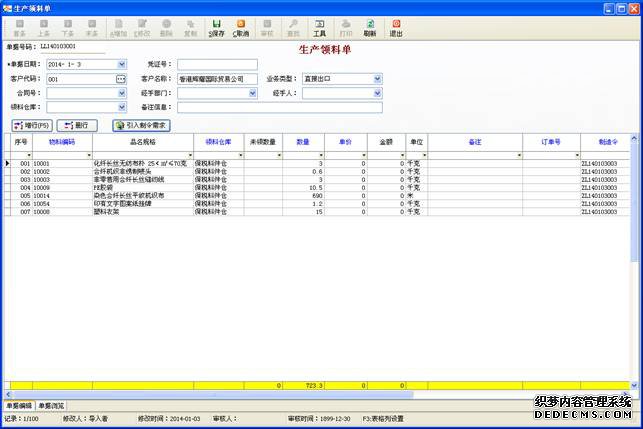 操作路徑:生產(chǎn)管理->生產(chǎn)領料單操作方法:單擊增加按鈕,然后選擇客戶資料,并通過增行和刪行按鈕選擇相應的生產(chǎn)料號,輸入數(shù)量等信息,然后保存并審核即可。